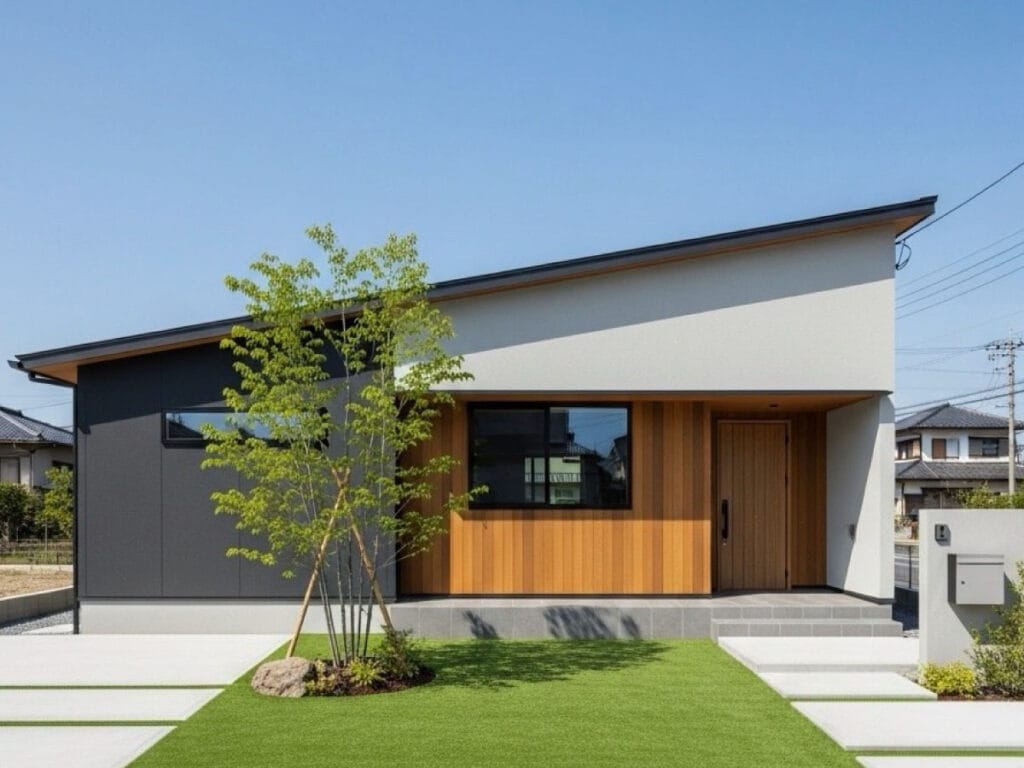 落ち着いた外観と木目アクセントが映える、コンパクトながら開放感のある24坪の平屋。一直線に抜けるLDKは家具配置がしやすく、自然光が心地よく差し込む設計です。水まわりを一か所にまとめ、家事動線も短く快適な暮らしを実現します。