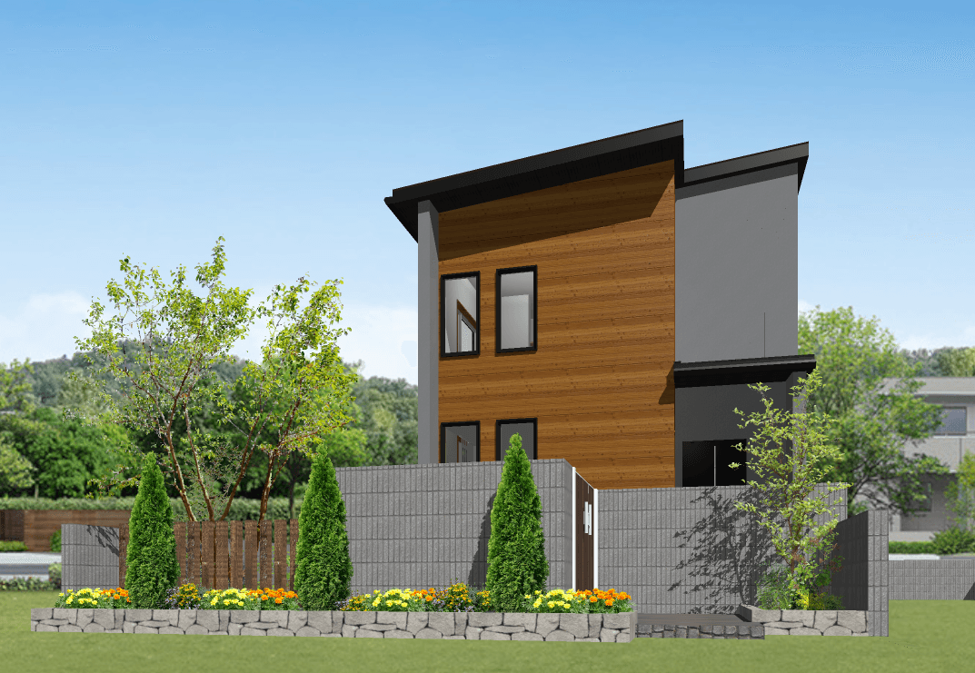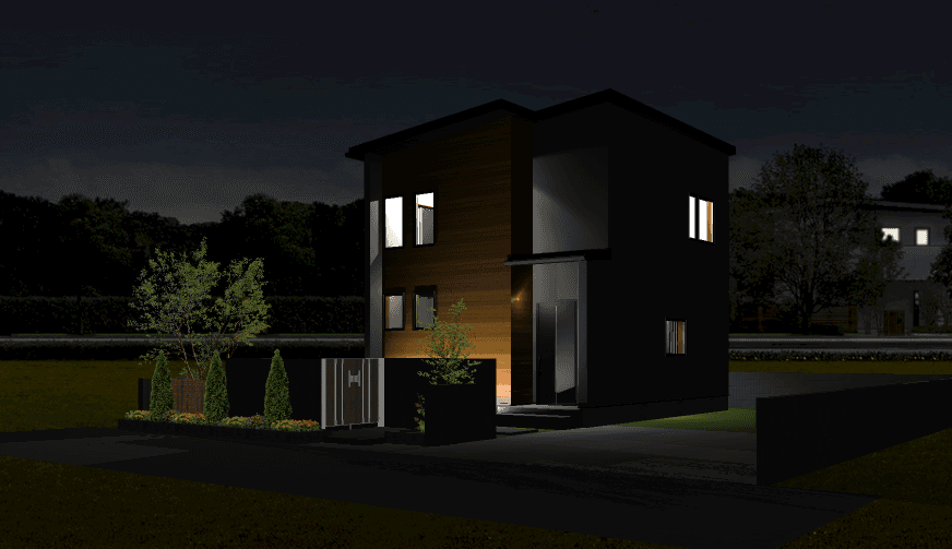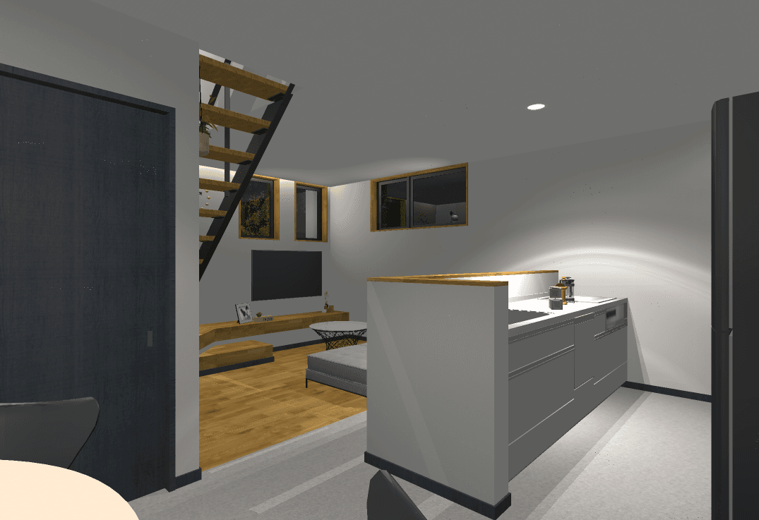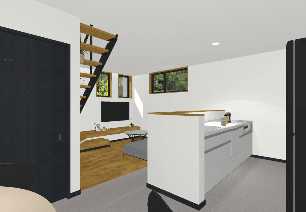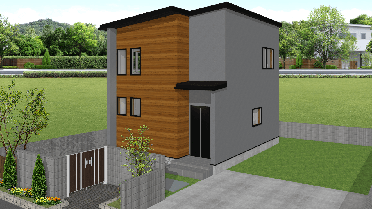 落ち着きのあるシンプルモダンな外観。室内はオープン階段が奥行きを生み、開放感のある空間を実現しました。造作カウンターや飾り棚が、暮らしの中に小さな“心地よさ”をプラス。コンパクトながらデザインと機能のバランスが取れたプランです。
