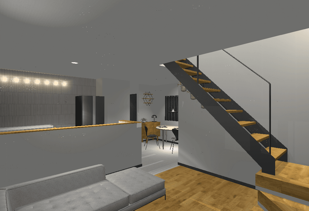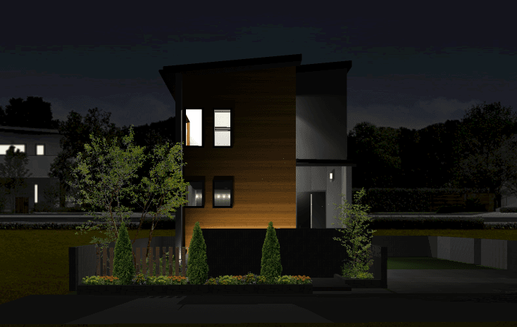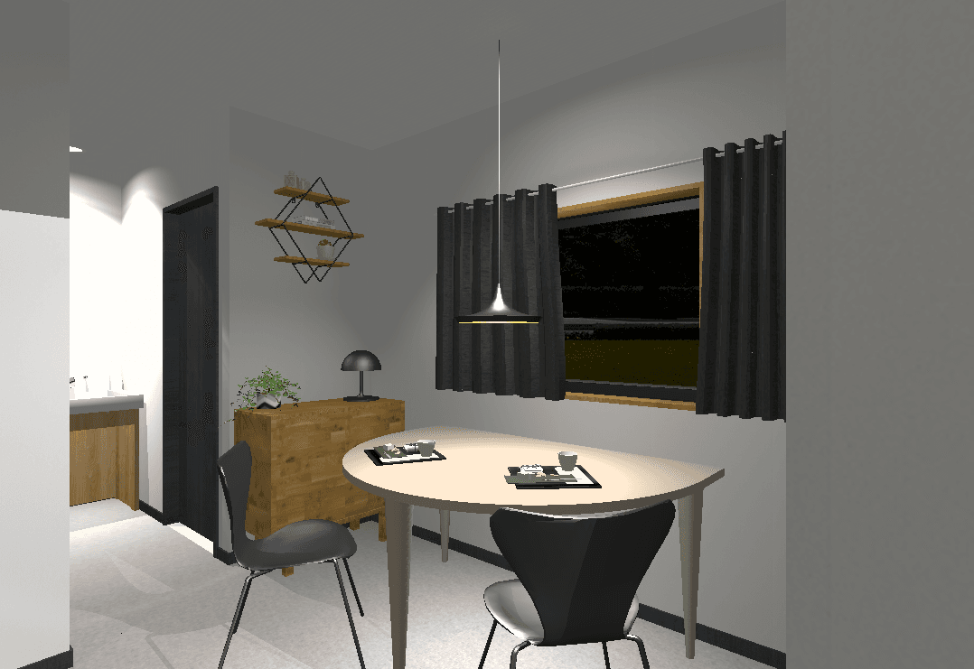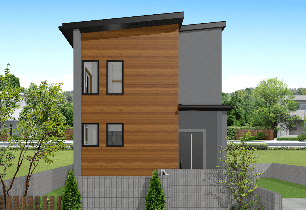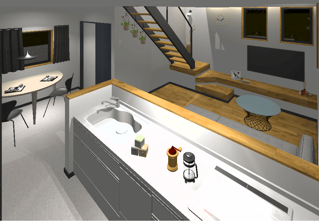 落ち着きのあるシンプルモダンな外観。室内はオープン階段が奥行きを生み、開放感のある空間を実現しました。造作カウンターや飾り棚が、暮らしの中に小さな“心地よさ”をプラス。コンパクトながらデザインと機能のバランスが取れたプランです。