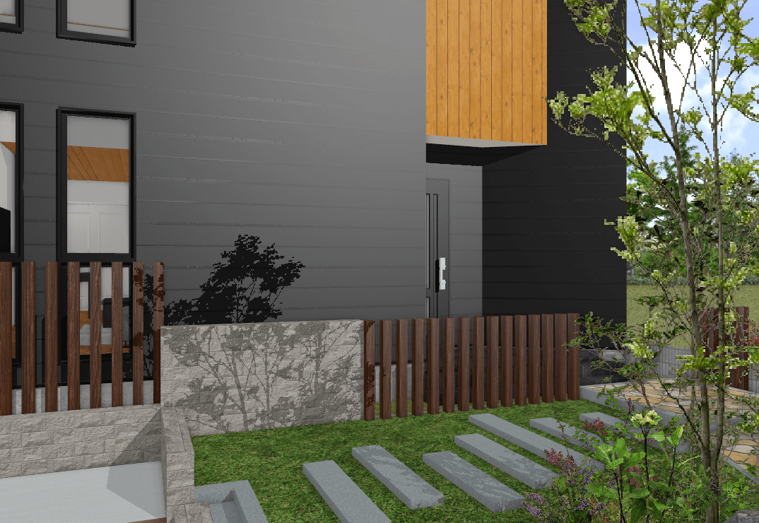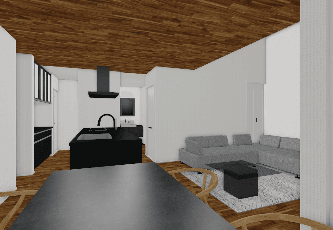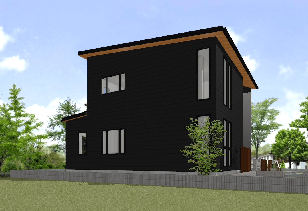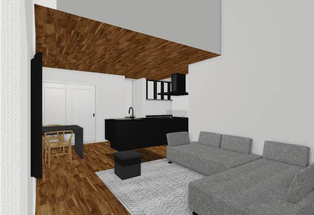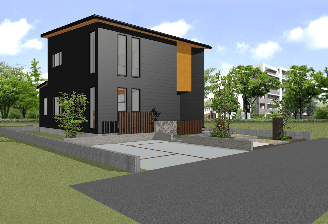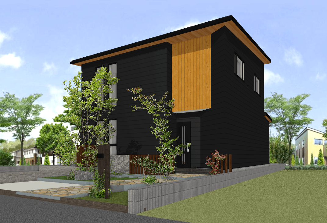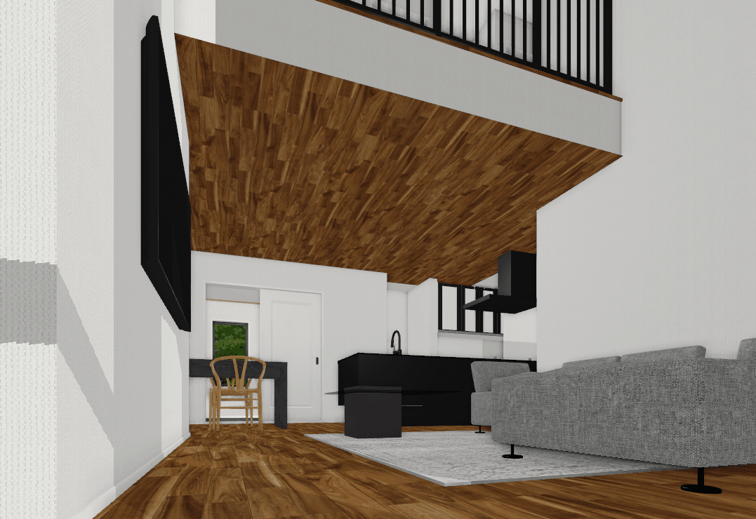 外壁の落ち着いた色と木目のアクセントが特徴のシンプルモダンデザイン。吹き抜けリビング、ダイニング、キッチンが一体となり、明るく開放感のある空間を作り出しています。自然素材を活かした温かみのある内装で、家族が快適に過ごせる設計です。