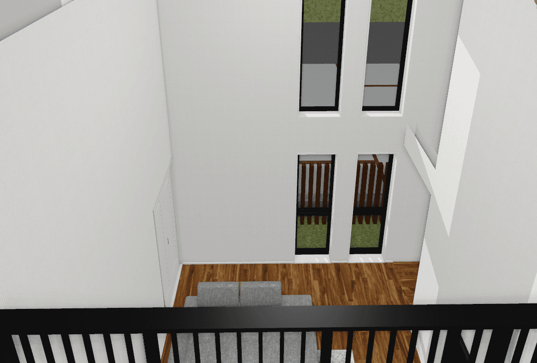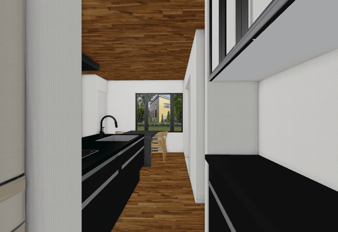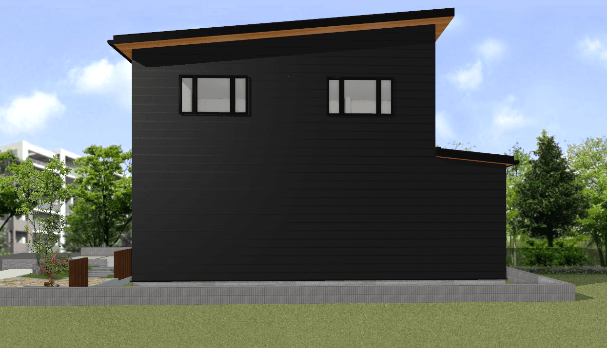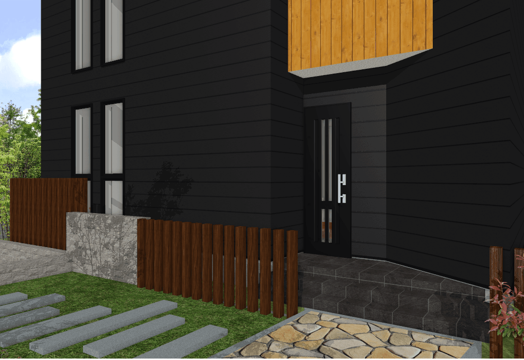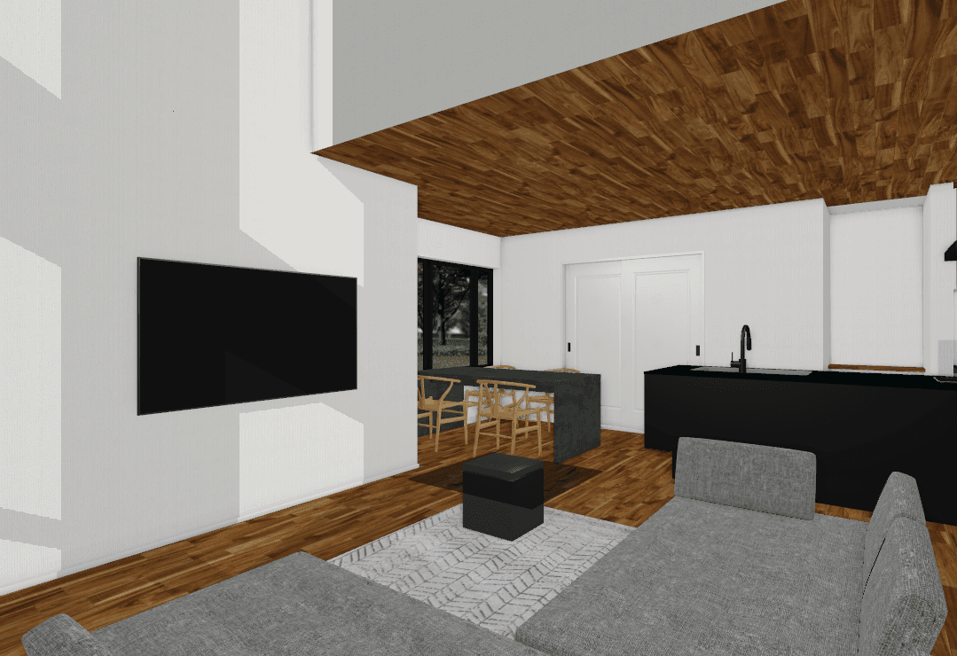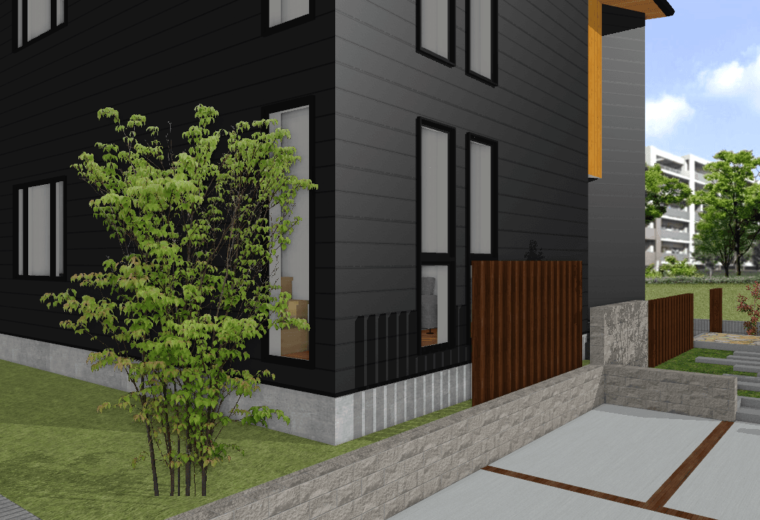 外壁の落ち着いた色と木目のアクセントが特徴のシンプルモダンデザイン。吹き抜けリビング、ダイニング、キッチンが一体となり、明るく開放感のある空間を作り出しています。自然素材を活かした温かみのある内装で、家族が快適に過ごせる設計です。