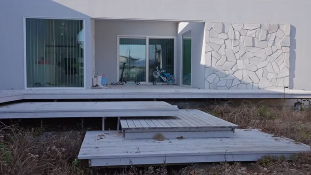 次に注目したのは、建物の前に広がるウッドデッキの作り込みです。単なる板張りではなく、わざと段差をつけ、さらに一段登るごとに板を貼る方向を90度変えていました。ウッドデッキに工夫を凝らすことで光の当たり方が変わり、外観に豊かな影(凸凹)が生まれます。ややイケメンさんは「影がないと建物は安っぽく見える」と教えてくれました。