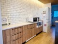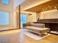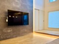 窓から光が降り注ぐ開放的なリビング。天井まで伸びるテレビ背面の落ち着いたグレーの壁と間接照明が、くつろぎの時間をやさしく包みます。小上がりの畳コーナーは、腰掛けたり、子どもの遊び場や愛犬の見守りスペースとしても活躍。