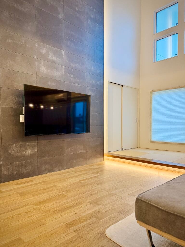 窓から光が降り注ぐ開放的なリビング。天井まで伸びるテレビ背面の落ち着いたグレーの壁と間接照明が、くつろぎの時間をやさしく包みます。小上がりの畳コーナーは、腰掛けたり、子どもの遊び場や愛犬の見守りスペースとしても活躍。
