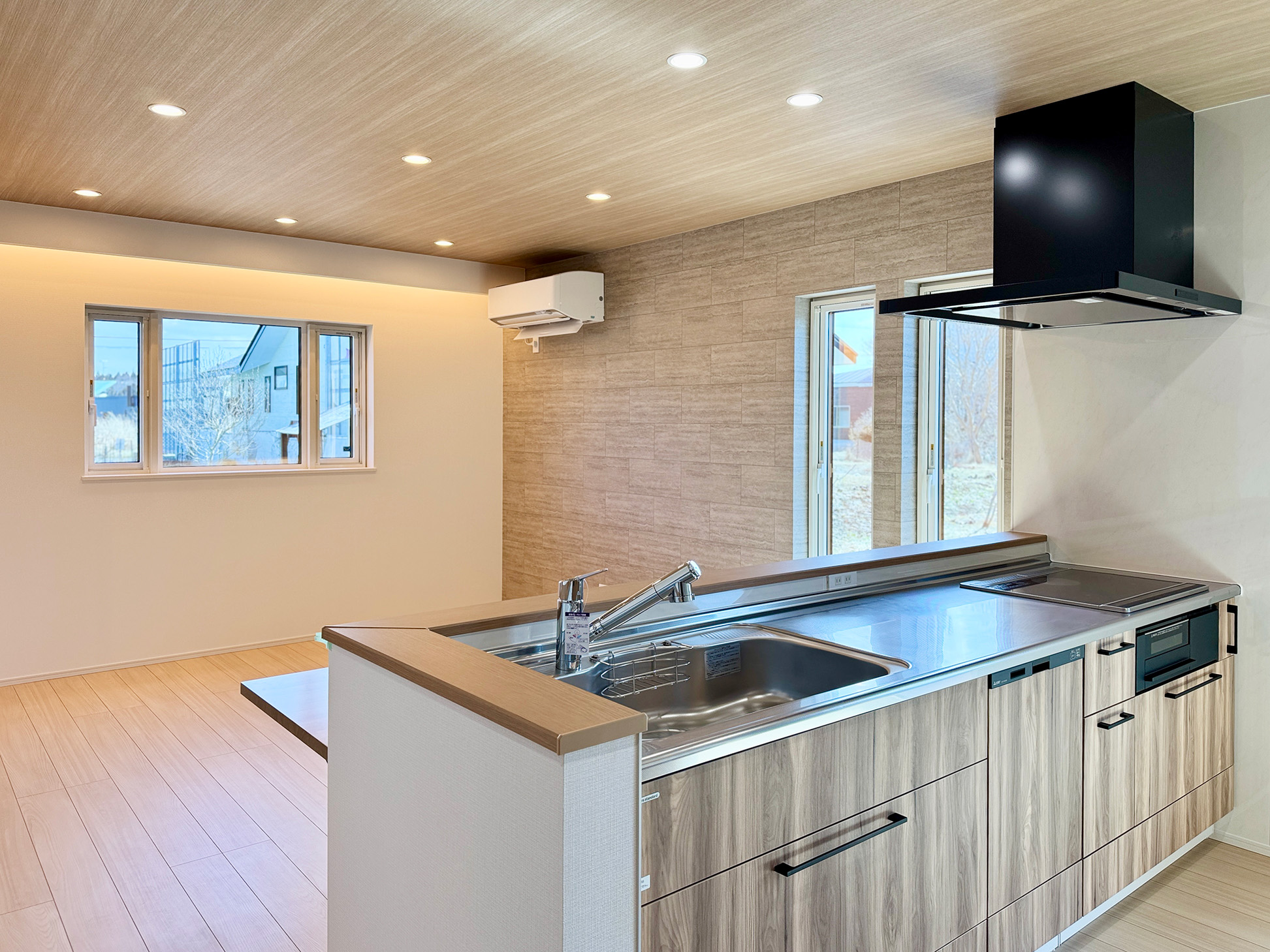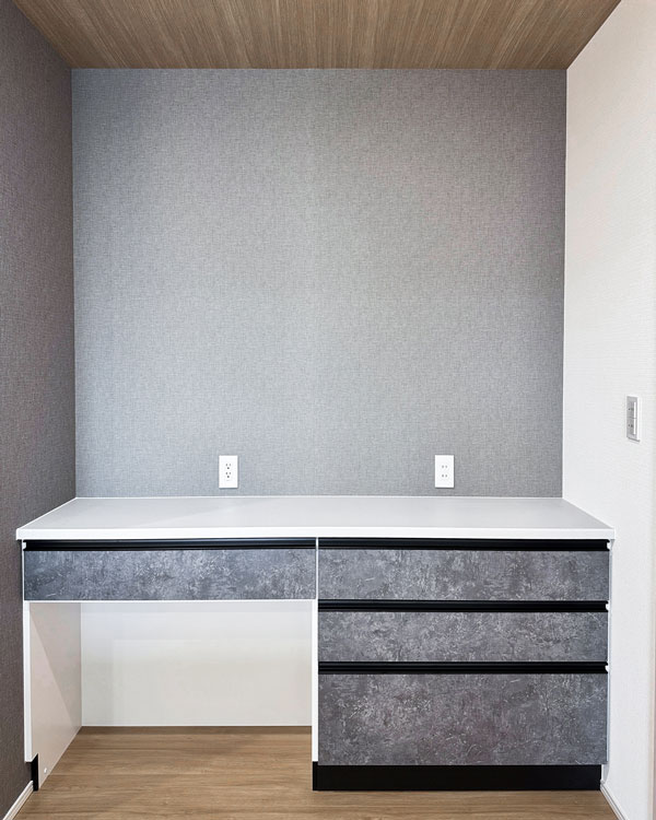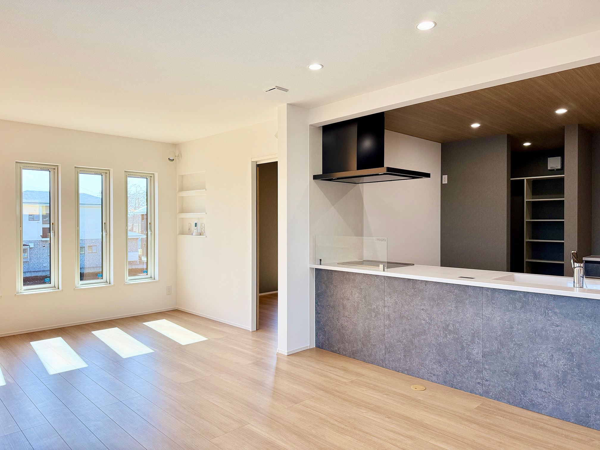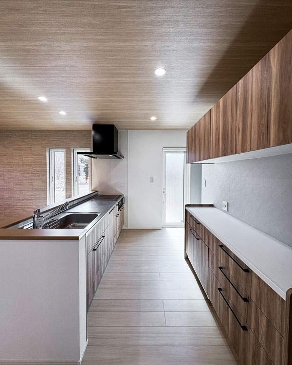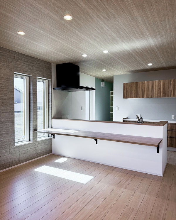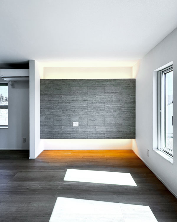 天井の木目クロスと、壁一面のグレータイル。対照的な素材を間接照明の柔らかなラインが繋ぎ、奥行きと品格を演出。家族の時間がゆっくりと流れる、上質なメインステージです。