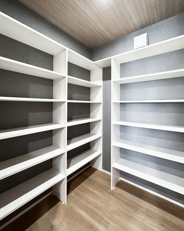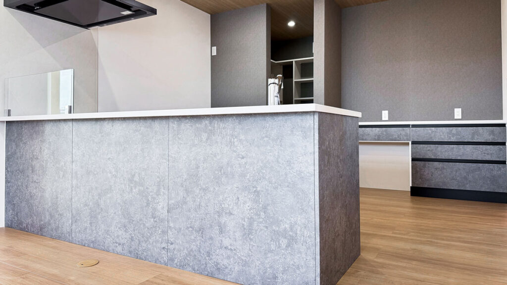 空間に馴染むグレーのペニンシュラキッチンを採用。その背後には大容量のウォークインパントリーを配置し、二世帯分の食材や道具を生活感なく収納できる「隠す美学」を徹底しました。