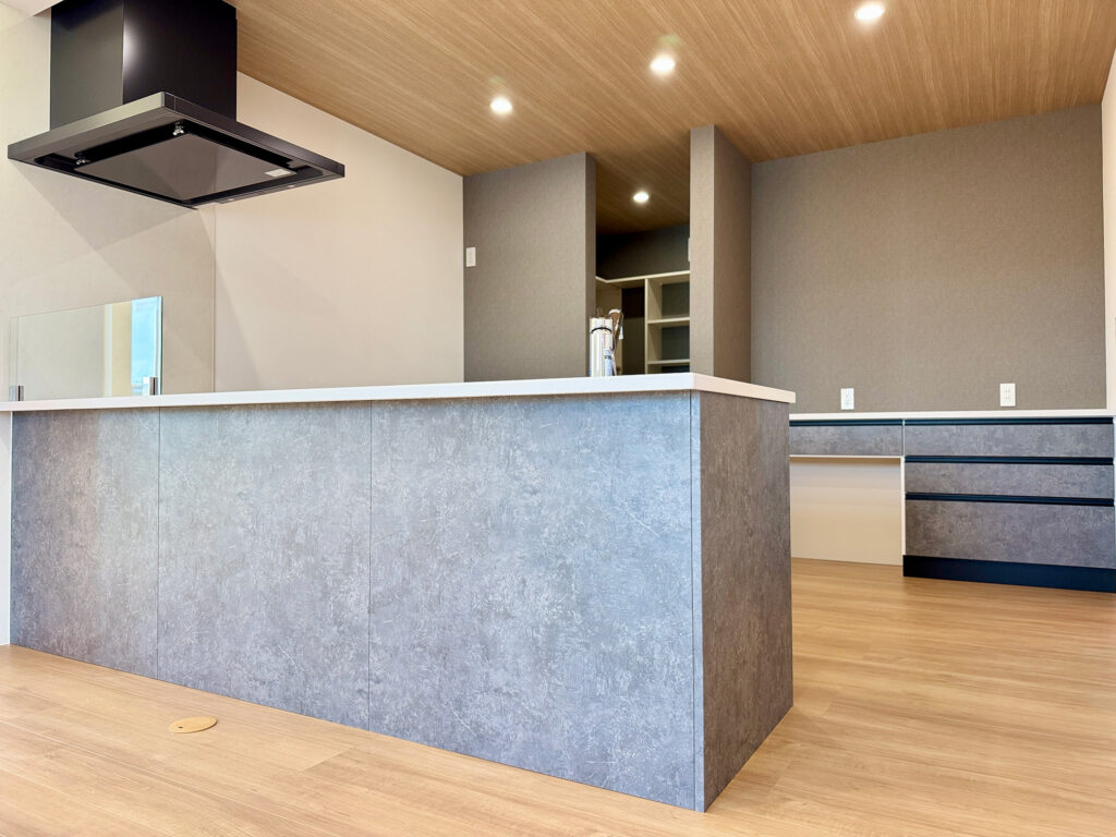 空間に馴染むグレーのペニンシュラキッチンを採用。その背後には大容量のウォークインパントリーを配置し、二世帯分の食材や道具を生活感なく収納できる「隠す美学」を徹底しました